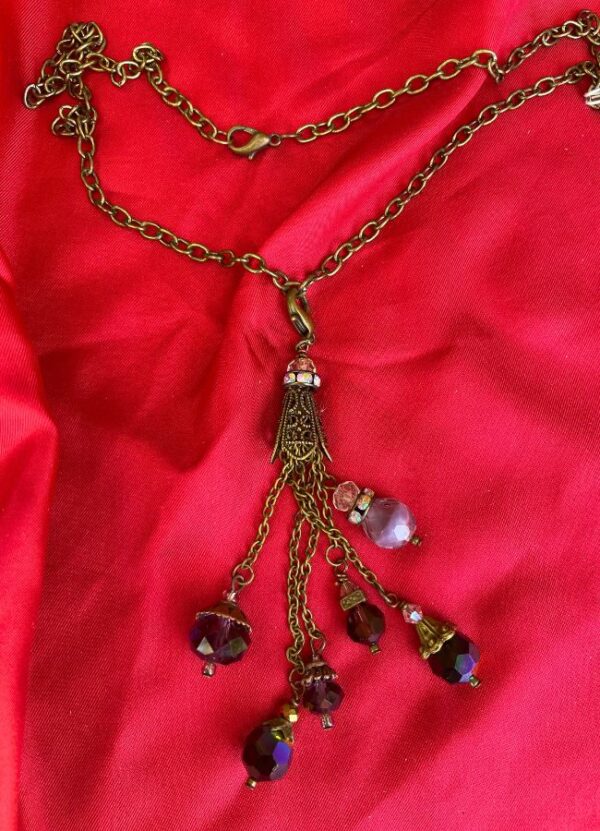 Hues of blue tumble down in varying lengths and sizes. This elegant, simple design features an antique style chain in brass tones.