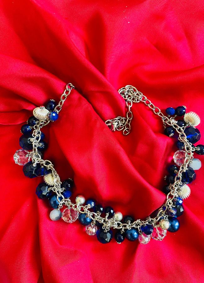 There are over four dozen beads in the Deep Blue Sea necklace. Accented by dark blues and clear crystals these creatures swim in harmony on a 22” chain.