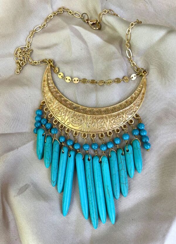 Hues of blue tumble down in varying lengths and sizes. This elegant, simple design features an antique style chain in brass tones.
